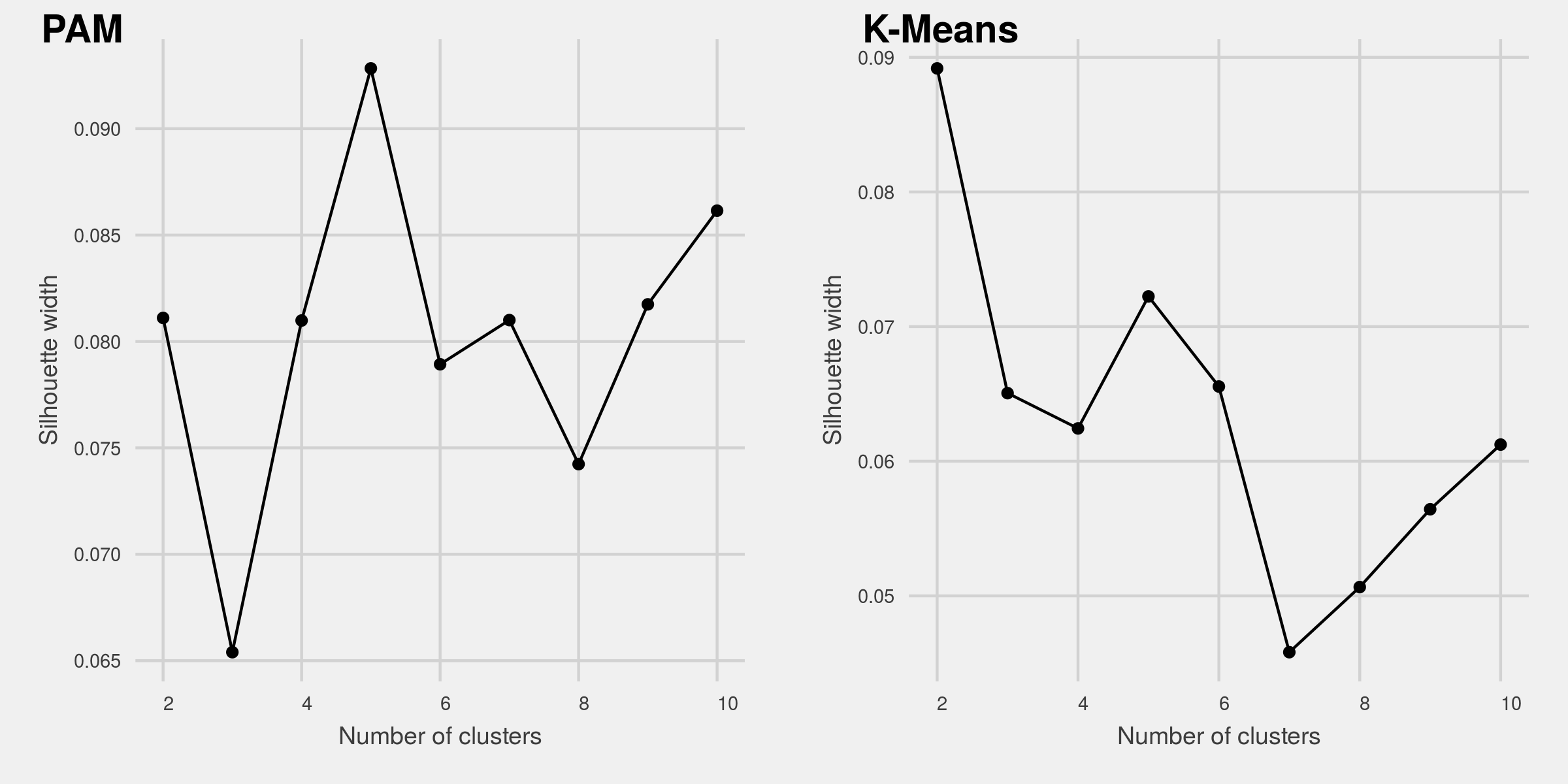 Select the number of clusters: A variety of metrics exist to help choose the number of clusters. In this analysis, I use Silhouette width as a validation metric. It is an aggregated measure of how similar an observation is to its own cluster compared its closest neighboring cluster. The metric can range from -1 to 1, where higher values are better. I then plot silhouette width for clusters ranging from 2 to 10 for both algorithms. From the Figure 1, we see that the PAM algorithm with 5 clusters yields the highest Silhouette value. On the other hand, K-Means with 2 clusters gives the highest Silhouette score.