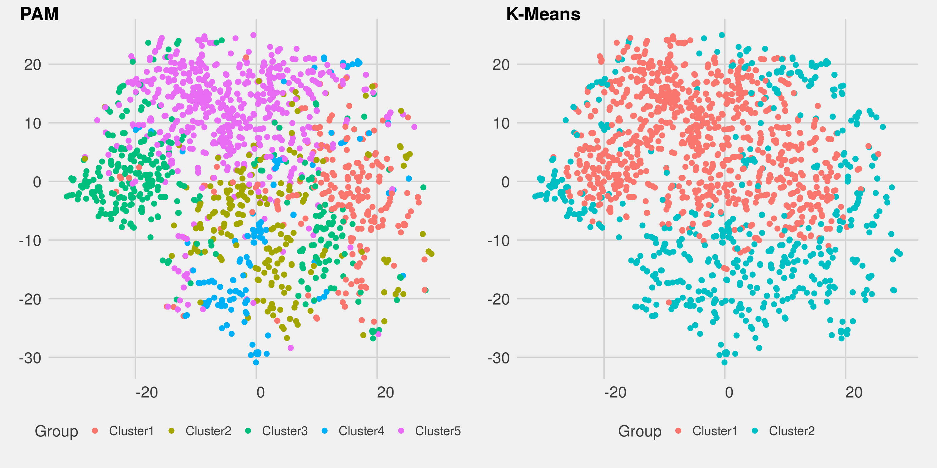 - Visualize clusters in lower dimensions: In order to see how well-separated clusters that PAM or k-means is able to detect, I employ t-distributed stochastic neighbor embedding (t-SNE) to visualize clusters in 2D. The technique tries to reduce the dimensionality of inputs, but still preserve its local structure. For further details, see the t-SNE software developed by Laurens van der Maaten.